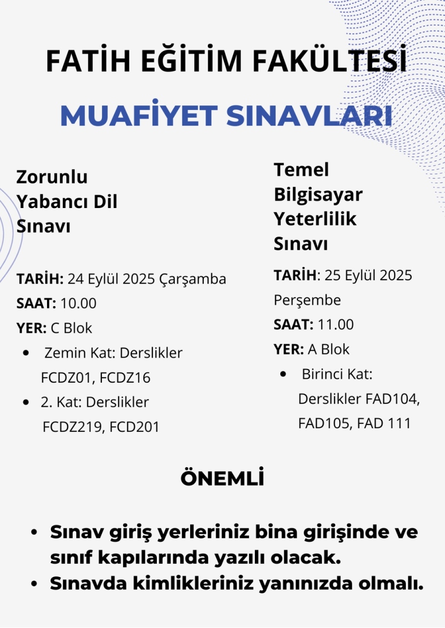 Fatih Eğitim Fakültesi Muafiyet Sınavlarında Öğrencilerimize Başarılar Dileriz.