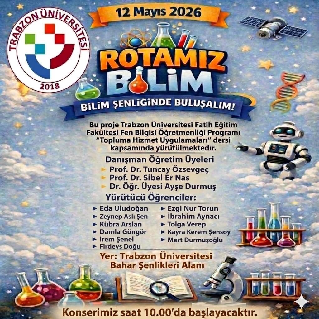 Fakültemiz Fen Bilgisi Öğretmenliği Programı tarafından Topluma Hizmet Uygulamaları dersi kapsamında Trabzon Özdemir Bayraktar Bilim Merkezi iş birliği ile “Rotamız Bilim” başlıklı bilim şenliği düzenleniyor. 12 Mayıs 2026 Salı günü gerçekleştirilecek etkinlikte, bilimsel farkındalığın artırılması ve ortaokul öğrencilerinin bilime olan ilgisinin desteklenmesi hedefleniyor.