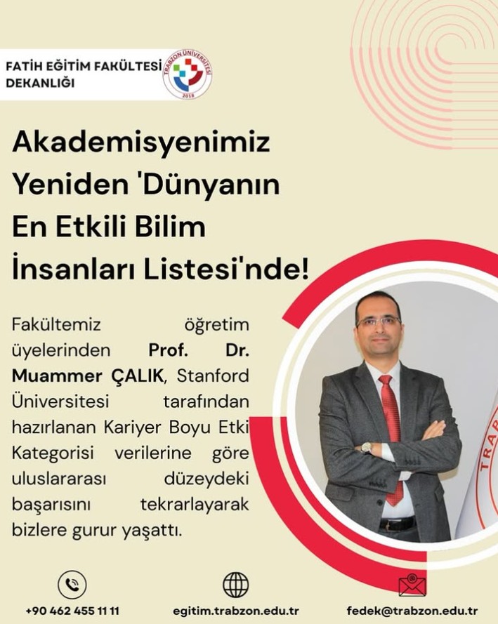 Dünyadaki bilim insanları arasında ilk yüzde 2’lik dilime giren akademisyenlerin yer aldığı ve Elsevier veri tabanında yayımlanan listede, “Kariyer Boyu Etki” kategorisinde en çok atıf alan bilim insanları arasında Fakültemiz öğretim üyelerinden Prof. Dr. Muammer Çalık yer almıştır.