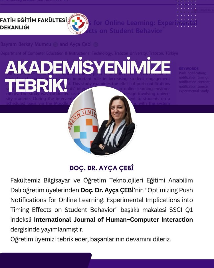 Fakültemiz Bilgisayar ve Öğretim Teknolojileri Eğitimi Anabilim Dalı öğretim üyelerinden Doç. Dr. Ayça Çebi’nin “Optimizing Push Notifications for Online Learning: Experimental Implications into Timing Effects on Student Behavior” başlıklı makalesi SSCI Q1 indeksli International Journal of Human–Computer Interaction dergisinde yayımlanmıştır.