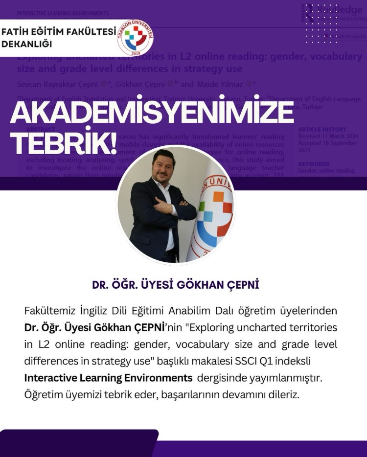 Dekan yardımcımız ve Fakültemiz İngiliz Dili Eğitimi Anabilim Dalı öğretim üyelerinden Dr. Öğr. Üyesi Gökhan Çepni’nin “Exploring uncharted territories in L2 online reading: gender, vocabulary size and grade level differences in strategy use” başlıklı makalesi SSCI Q1 indeksli Interactive Learning Environments dergisinde yayımlanmıştır.