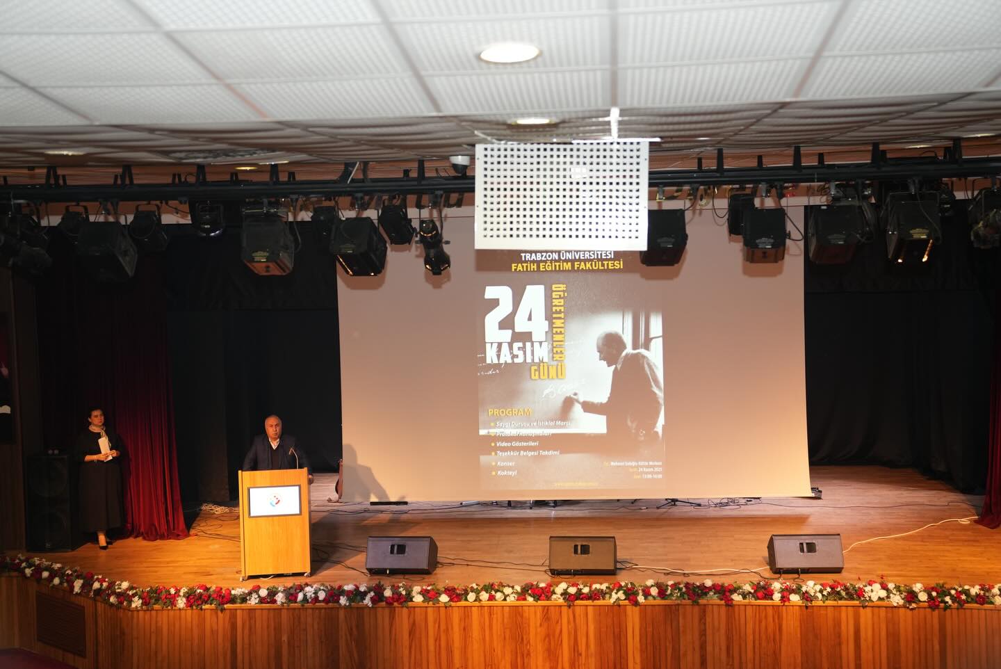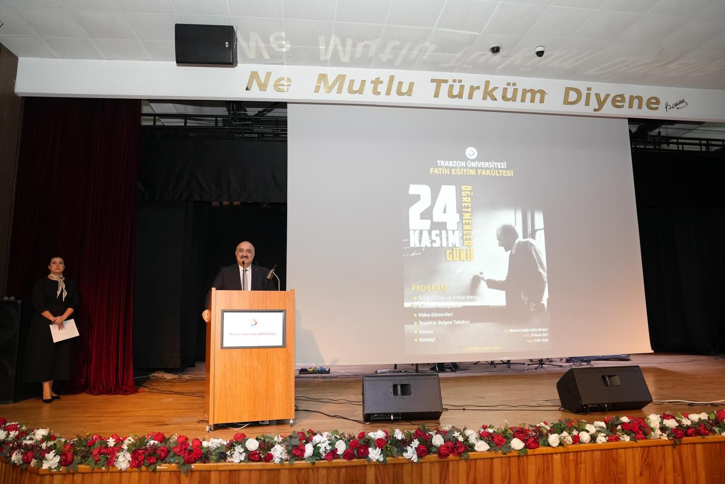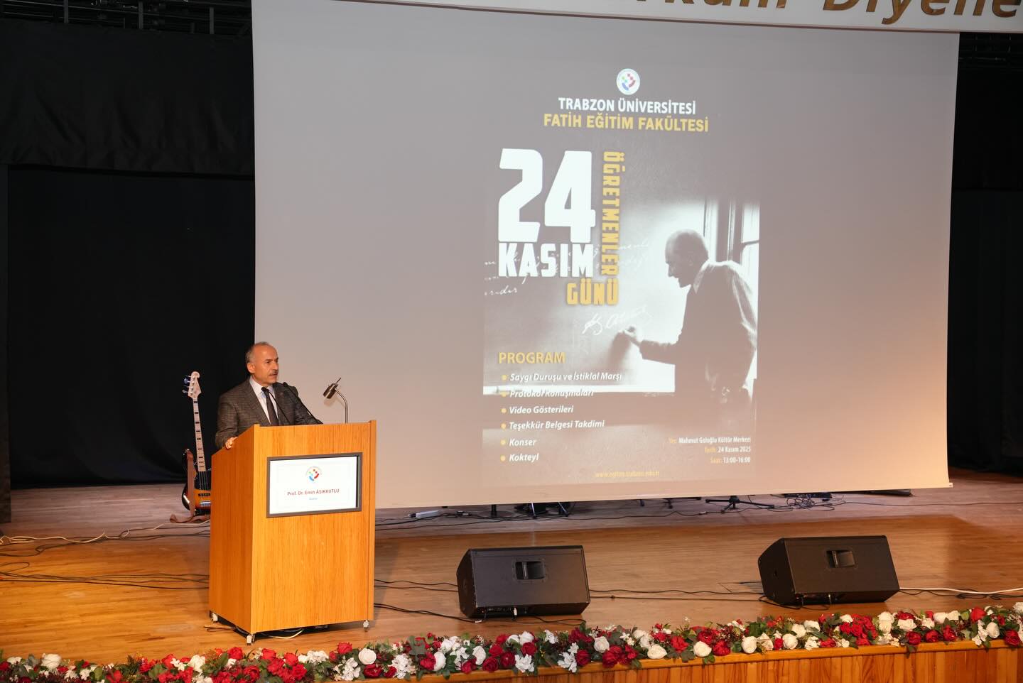 24 Kasım Öğretmenler Günü münasebetiyle Fakültemizde geniş içerikli bir kutlama programı gerçekleştirildi. Mahmut Goloğlu Kültür Merkezinde düzenlenen programa Rektörümüz Prof. Dr. Emin Âşıkkutlu, Akçaabat Belediye Başkanvekili Cevdet Bayraktar, Genel Sekreterimiz Doç. Dr. Ufuk Töman, dekanlarımız, müdürlerimiz, daire başkanları ile akademisyenlerimiz ve çok sayıda öğrencimiz katıldı. Ayrıca programa eğitim camiasından misafirlerle emekli hocalarımız da yoğun ilgi gösterdi.