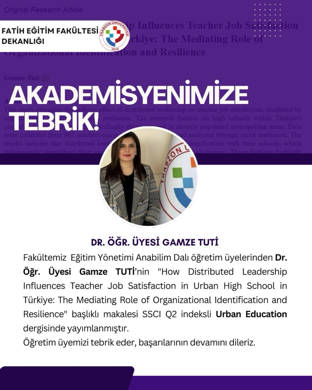 Fakültemiz Eğitim Yönetimi Ana Bilim Dalı öğretim üyelerinden Dr. Öğr. Üyesi Gamze Tuti’nin “How Distributed Leadership Influences Teacher Job Satisfaction in Urban High School in Türkiye: The Mediating Role of Organizational Identification and Resilience” başlıklı makalesi SSCI Q2 indeksli Urban Education dergisinde yayımlanmıştır.