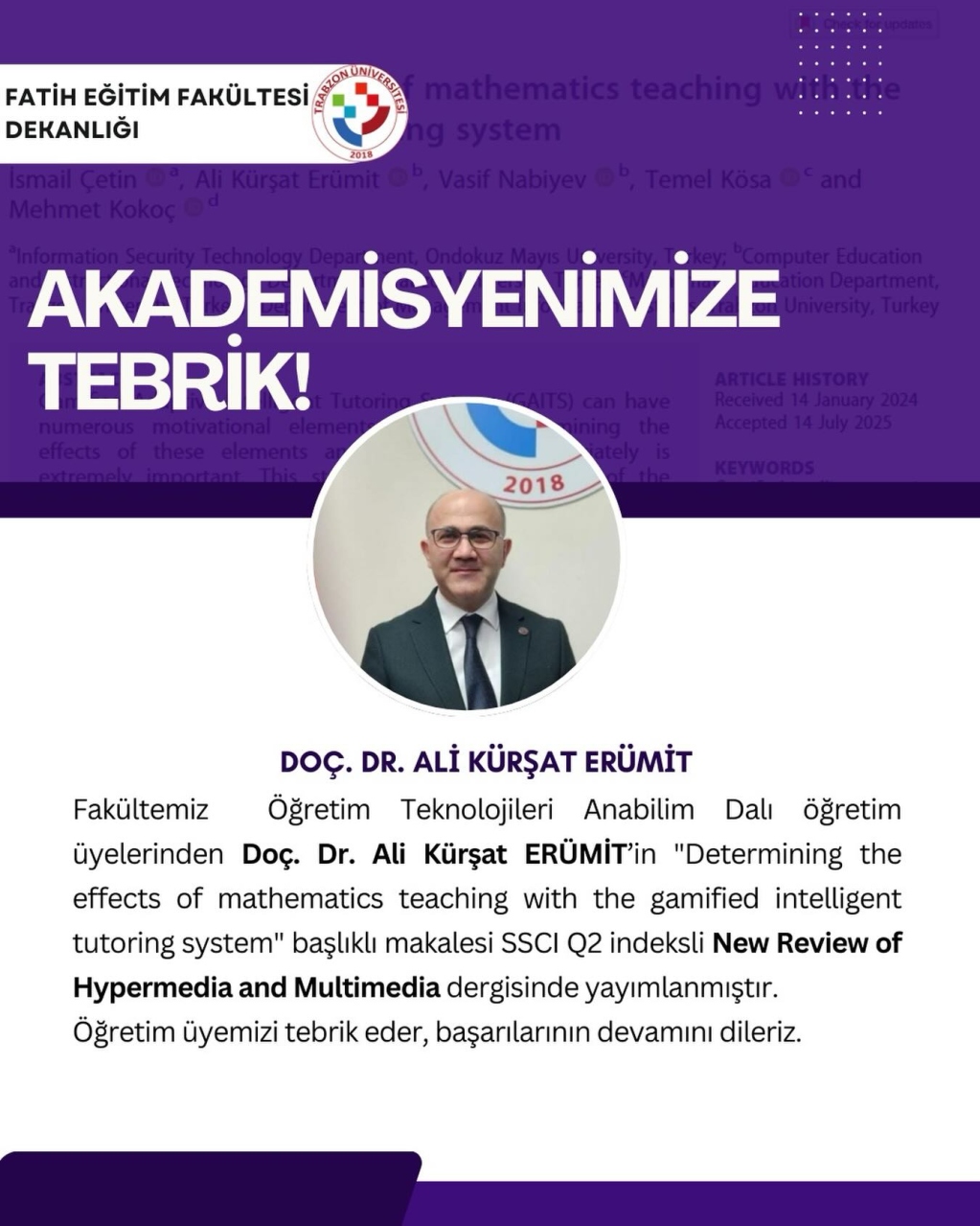 Fakültemiz Öğretim Teknolojileri Anabilim Dalı öğretim üyelerinden Doç. Dr. Ali Kürşat Erümit’in “Determining the effects of mathematics teaching with the gamified intelligent tutoring system” başlıklı makalesi SSCI Q2 indeksli New Review of Hypermedia and Multimedia dergisinde yayımlanmıştır.