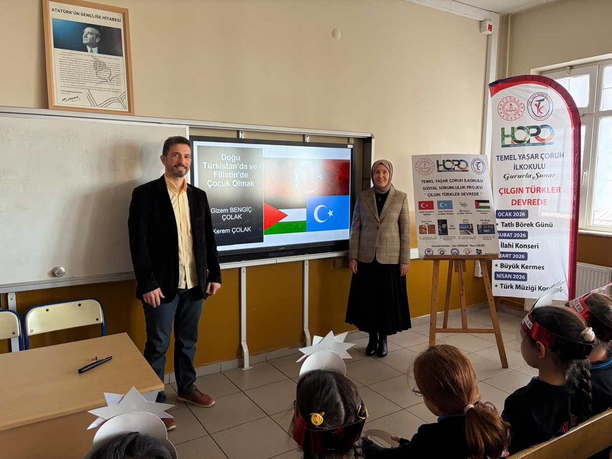 Temel Yaşar Çoruh İlkokulu öğretmenleri Sait Atakan ve Barış Kılınç tarafından HOPO kapsamında planlanan “Çılgın Türkler Devrede” adlı projeye, Türkçe ve Sosyal Bilimler Eğitimi Bölümü akademisyenlerimizden Dr. Öğr. Üyesi Gizem Bengiç Çolak ve Doç. Dr. Kerem Çolak tarafından akademik destek sağlanmıştır. Bu kapsamda, 15.01.2026 tarihinde “Doğu Türkistan’da ve Filistin’de Çocuk Olmak” başlıklı bir seminer gerçekleştirilmiştir.