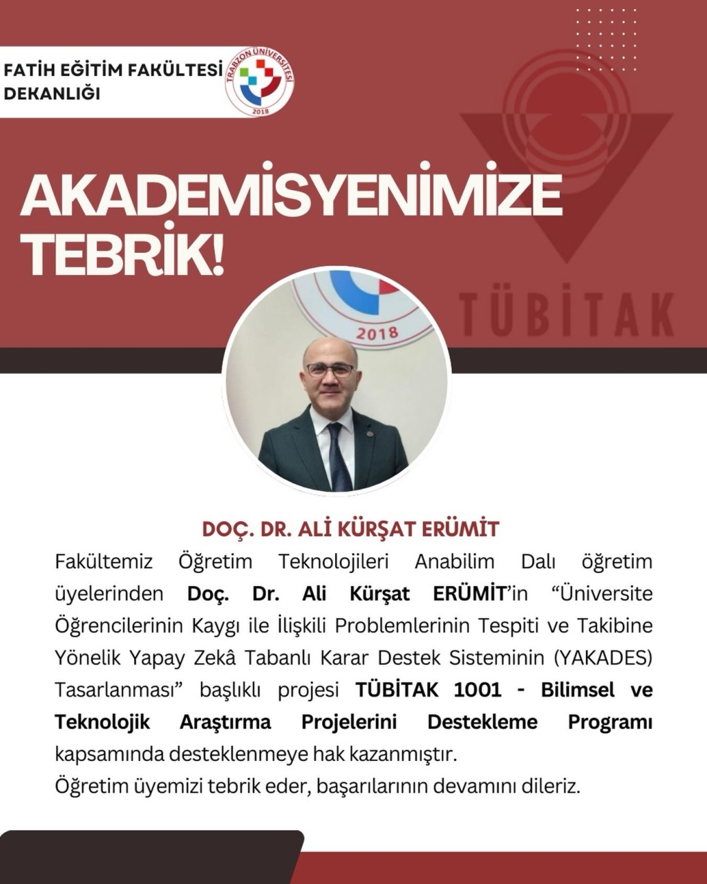 Fakültemiz Öğretim Teknolojileri Anabilim Dalı öğretim üyelerinden Doç. Dr. Ali Kürşat Erümit’in “Üniversite Öğrencilerinin Kaygı ile İlişkili Problemlerinin Tespiti ve Takibine Yönelik Yapay Zekâ Tabanlı Karar Destek Sisteminin (YAKADES) Tasarlanması” başlıklı projesi TÜBİTAK 1001 - Bilimsel ve Teknolojik Araştırma Projelerini Destekleme Programı kapsamında desteklenmeye hak kazanmıştır.