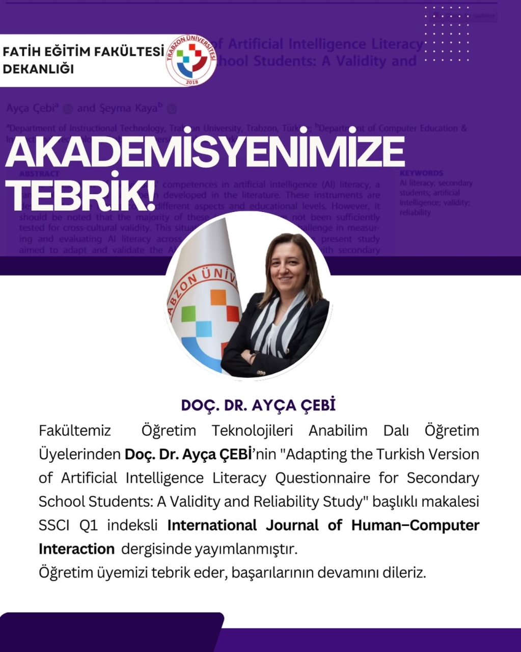 Fakültemiz Öğretim Teknolojileri Anabilim Dalı Öğretim Üyelerinden Doç. Dr. Ayça ÇEBİ’nin “Adapting the Turkish Version of Artificial Intelligence Literacy Questionnaire for Secondary School Students: A Validity and Reliability Study” başlıklı makalesi SSCI Q1 indeksli International Journal of Human–Computer Interaction dergisinde yayımlanmıştır.