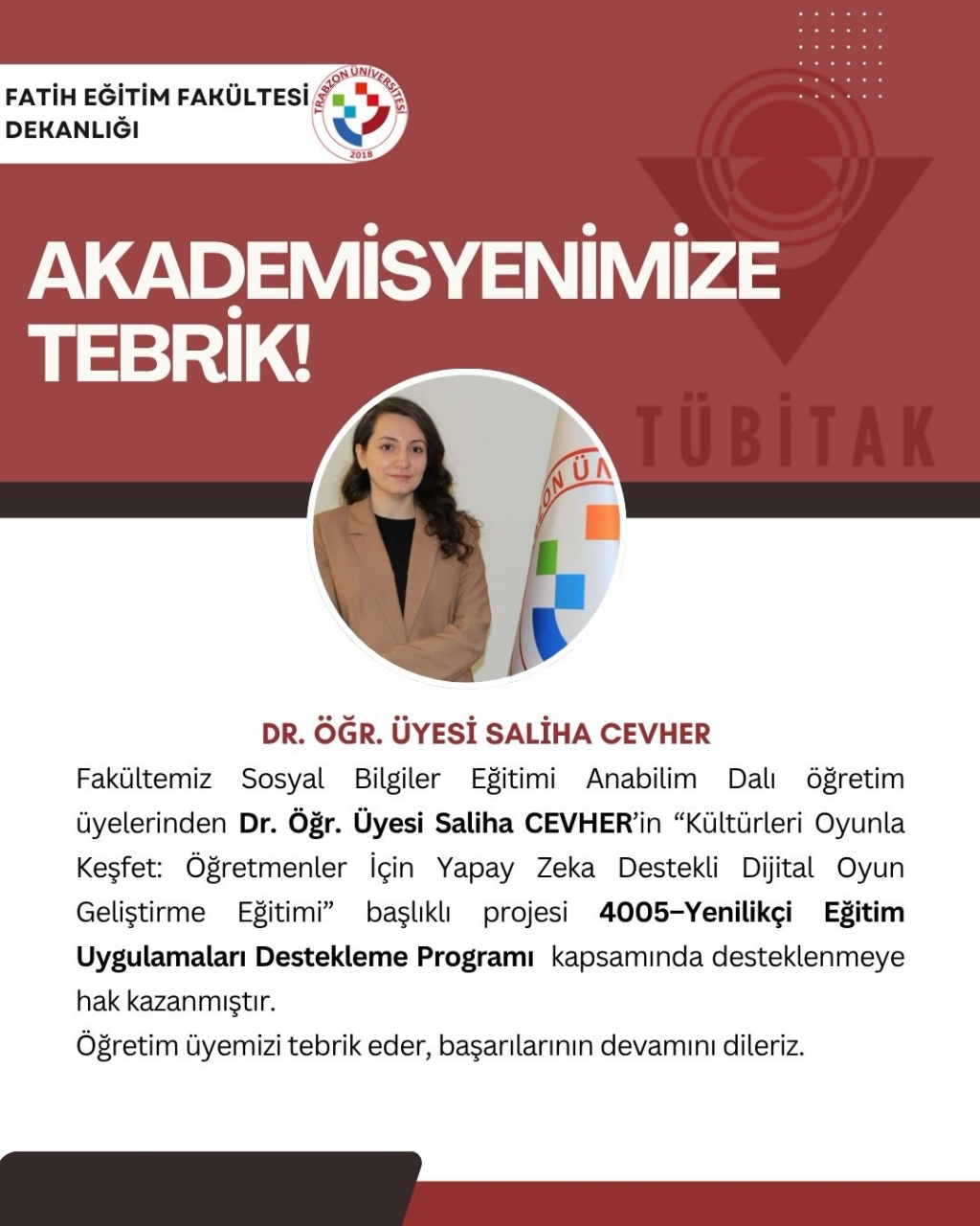 Fakültemiz Sosyal Bilgiler Eğitimi Anabilim Dalı öğretim üyelerinden Dr. Öğr. Üyesi Saliha Cevher’in “Kültürleri Oyunla Keşfet: Öğretmenler İçin Yapay Zeka Destekli Dijital Oyun Geliştirme Eğitimi” başlıklı projesi 4005–Yenilikçi Eğitim Uygulamaları Destekleme Programı kapsamında desteklenmeye hak kazanmıştır.