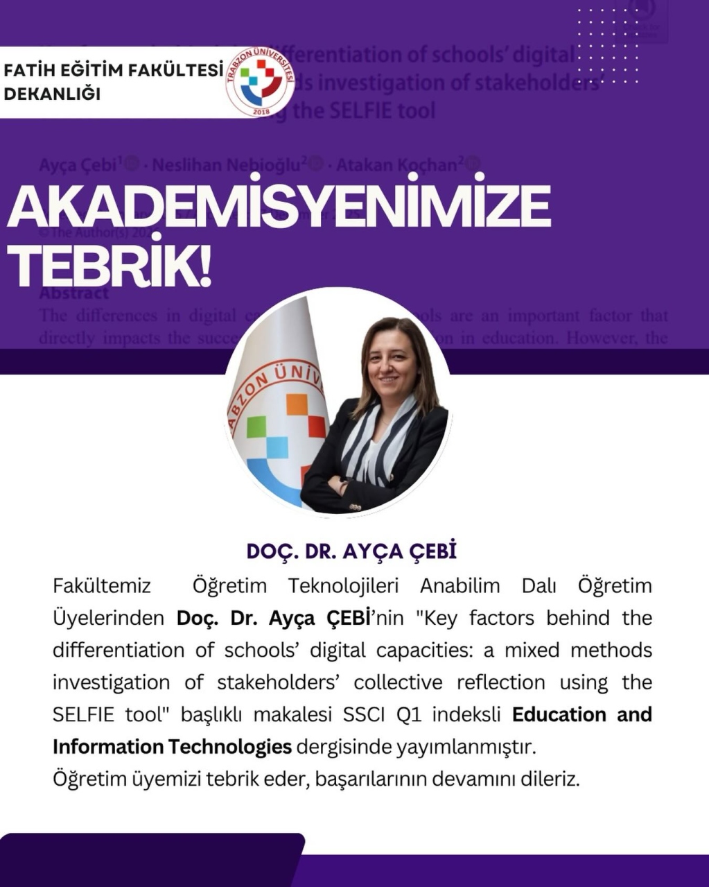 Fakültemiz Öğretim Teknolojileri Anabilim Dalı Öğretim Üyelerinden Doç. Dr. Ayça ÇEBİ’nin “Key factors behind the differentiation of schools’ digital capacities: a mixed methods investigation of stakeholders’ collective reflection using the SELFIE tool” başlıklı makalesi SSCI Q1 indeksli Education and Information Technologies dergisinde yayımlanmıştır.