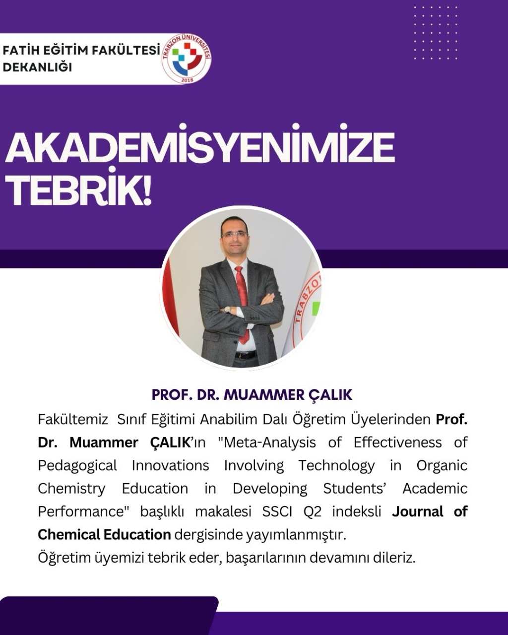 Fakültemiz Sınıf Eğitimi Anabilim Dalı Öğretim Üyelerinden Prof. Dr. Muammer ÇALIK’ın “Effectiveness of treatments teaching the topic ‘cell division’ in improving students’ academic performance: a meta-analysis study” başlıklı makalesi SSCI Q2 indeksli Research in Science & Technological Education dergisinde; “Meta-Analysis of Effectiveness of Pedagogical Innovations Involving Technology in Organic Chemistry Education in Developing Students’ Academic Performance” başlıklı makalesi SSCI Q2 indeksli Journal of Chemical Education dergisinde yayımlanmıştır.